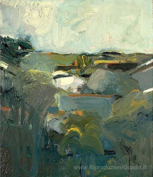 Ti offriamo una riproduzione artigianale su tela dell'opera famosa 'Case e Colline' di Elmer Bischoff, dal Museo delle Riproduzioni.
