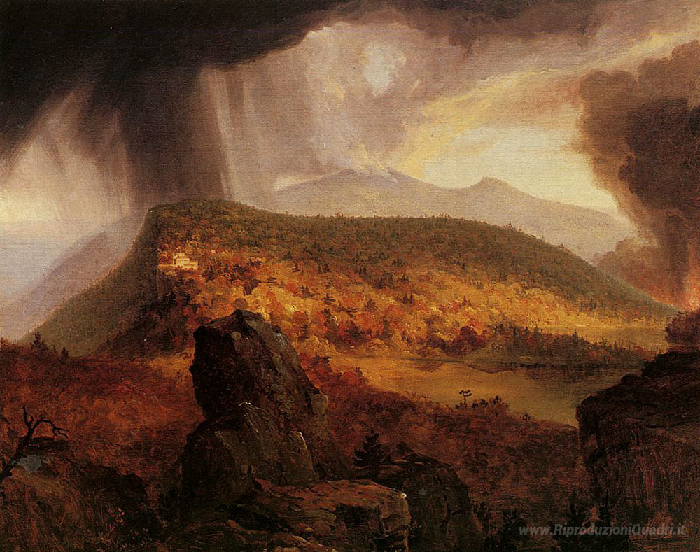 Ti offriamo una riproduzione artigianale su tela dell'opera famosa 'Catskill Mountain House, I quattro elementi' di Thomas Cole, dal Museo delle Riproduzioni.