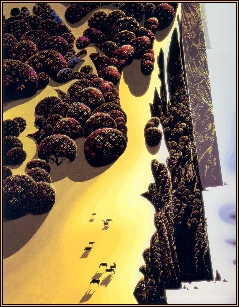 Ti offriamo una riproduzione artigianale su tela dell'opera famosa 'Cavalli by the Sea' di Eyvind Earle, dal Museo delle Riproduzioni.