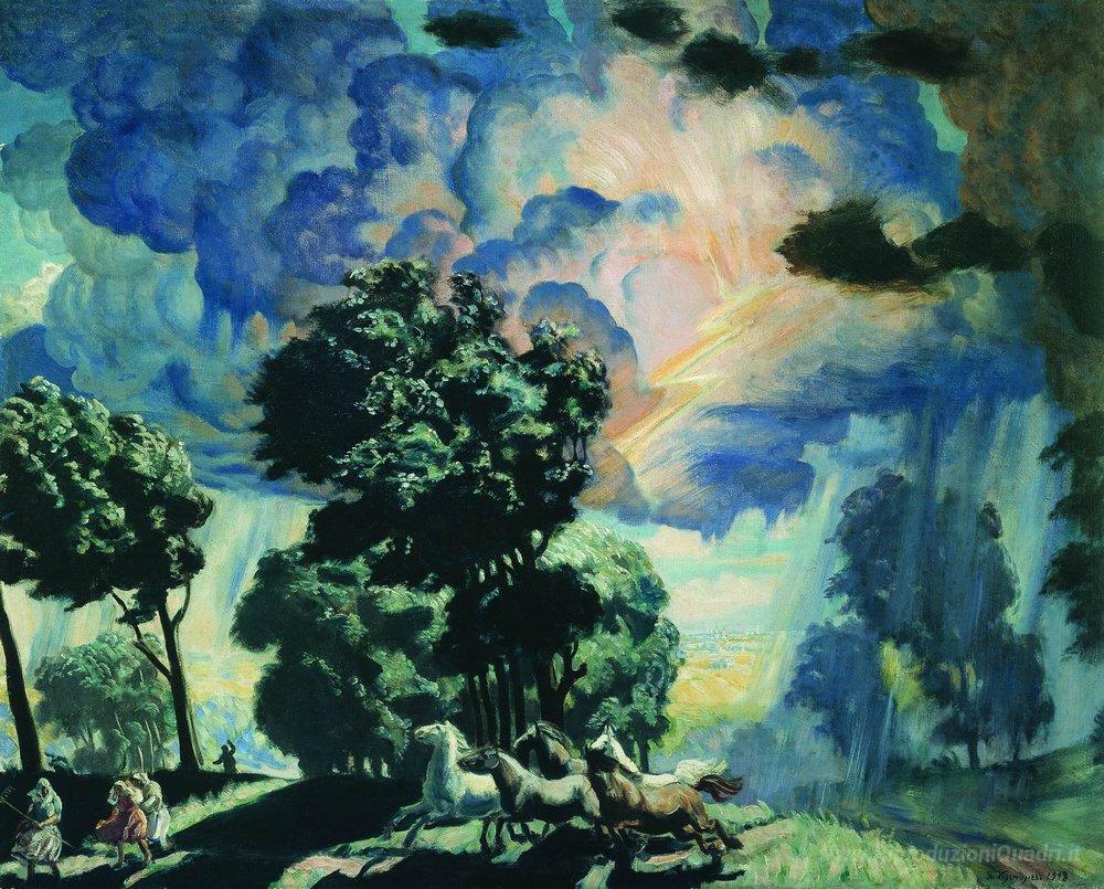 Ti offriamo una riproduzione artigianale su tela dell'opera famosa 'Cavalli nella tempesta' di Boris Kustodiev, dal Museo delle Riproduzioni.
