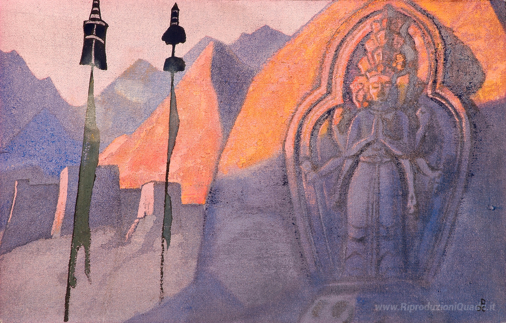 Ti offriamo una riproduzione artigianale su tela dell'opera famosa 'Chenrezig' di Nicholas Roerich, dal Museo delle Riproduzioni.