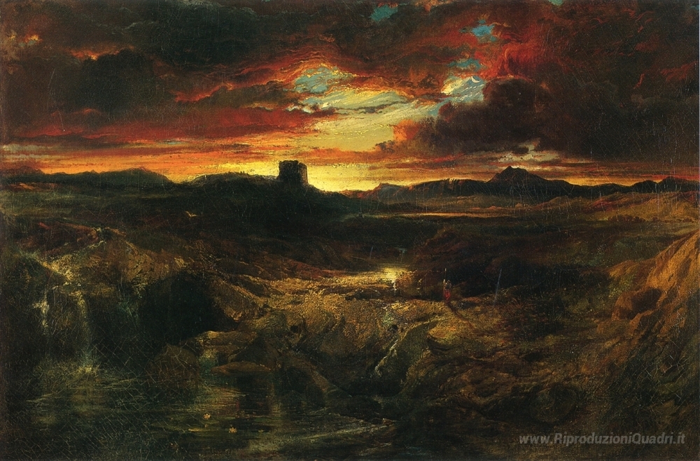 Ti offriamo una riproduzione artigianale su tela dell'opera famosa 'Childe Roland alla Torre Nera Came' di Thomas Moran, dal Museo delle Riproduzioni.