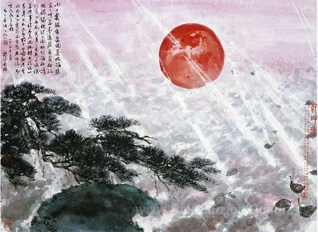 Ti offriamo una riproduzione artigianale su tela dell'opera famosa 'Cielo e Terra Glow Red' di Fu Baoshi, dal Museo delle Riproduzioni.