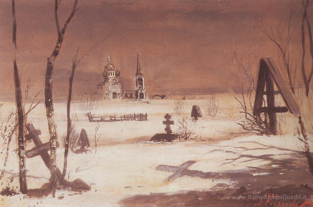 Ti offriamo una riproduzione artigianale su tela dell'opera famosa 'Cimitero rurale al chiaro di luna' di Aleksey Savrasov, dal Museo delle Riproduzioni.