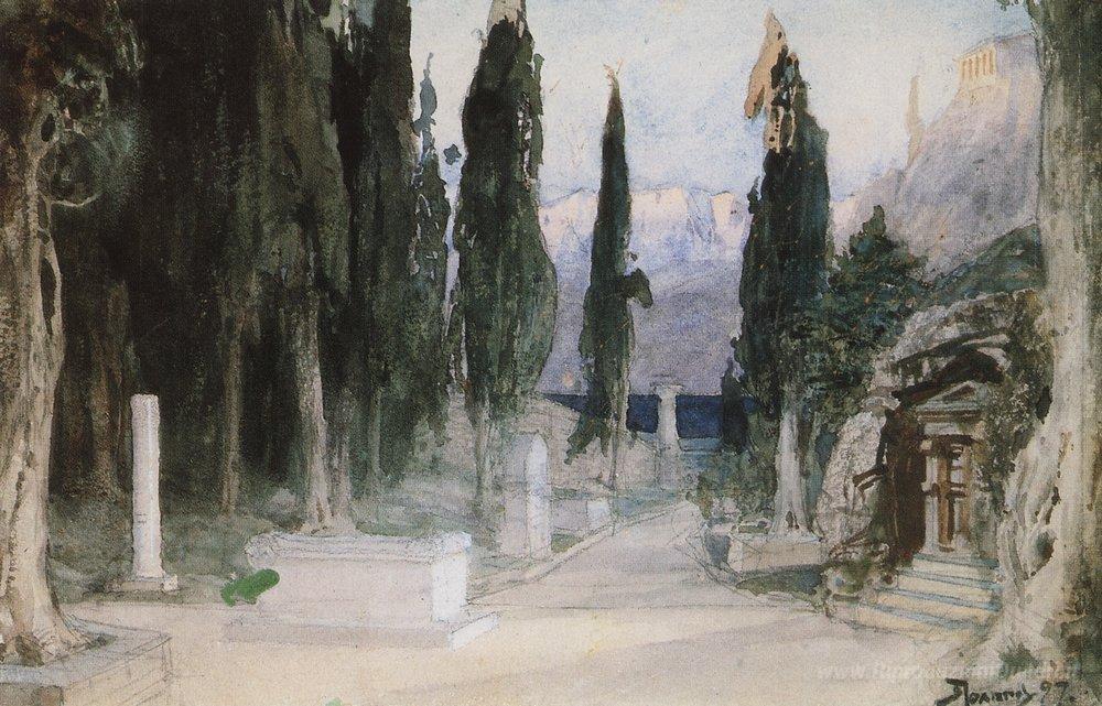 Ti offriamo una riproduzione artigianale su tela dell'opera famosa 'Cimitero tra il cipresso' di Vasily Polenov, dal Museo delle Riproduzioni.