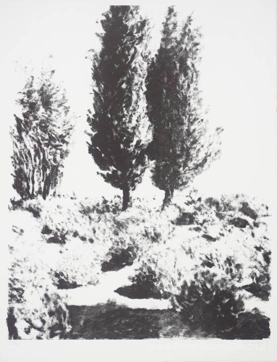 Ti offriamo una riproduzione artigianale su tela dell'opera famosa 'Cipressi Gerusalemme e Lavanda' di Avigdor Arikha, dal Museo delle Riproduzioni.