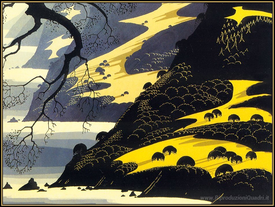 Ti offriamo una riproduzione artigianale su tela dell'opera famosa 'Coastal Nebbia' di Eyvind Earle, dal Museo delle Riproduzioni.