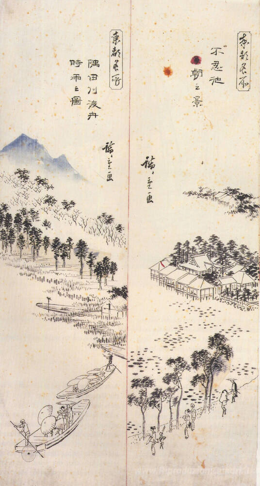 Ti offriamo una riproduzione artigianale su tela dell'opera famosa 'Complesso del tempio su un'isola e traghetti su un fiume' di Hiroshige, dal Museo delle Riproduzioni.