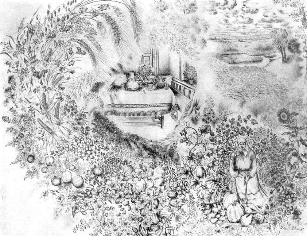 Ti offriamo una riproduzione artigianale su tela dell'opera famosa 'Contadino Collettiva' di Kateryna Bilokur, dal Museo delle Riproduzioni.