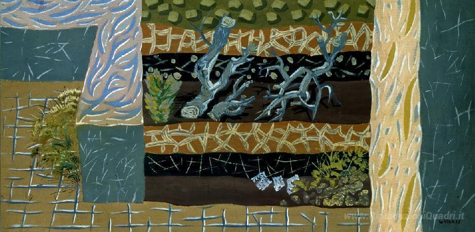 Ti offriamo una riproduzione artigianale su tela dell'opera famosa 'Contenitori e rami spezzati' di Nikos Hadjikyriakos-Ghikas, dal Museo delle Riproduzioni.