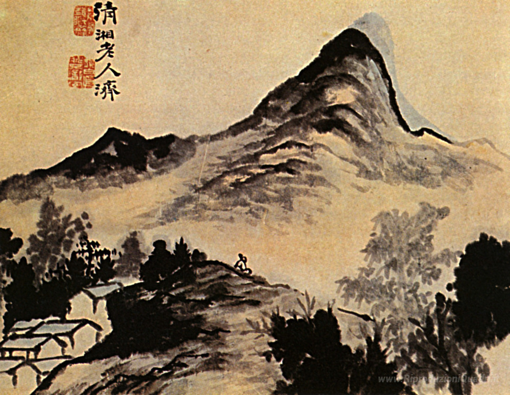 Ti offriamo una riproduzione artigianale su tela dell'opera famosa 'Conversazione con la montagna' di Shitao, dal Museo delle Riproduzioni.