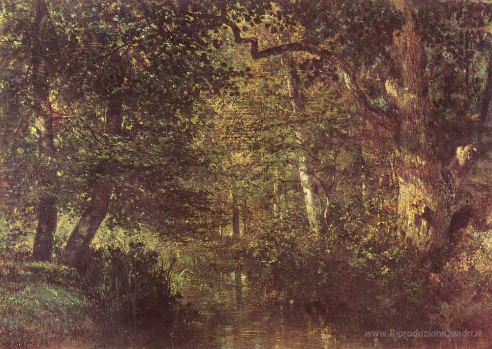 Ti offriamo una riproduzione artigianale su tela dell'opera famosa 'Corso d'acqua nel bosco' di Constant Troyon, dal Museo delle Riproduzioni.