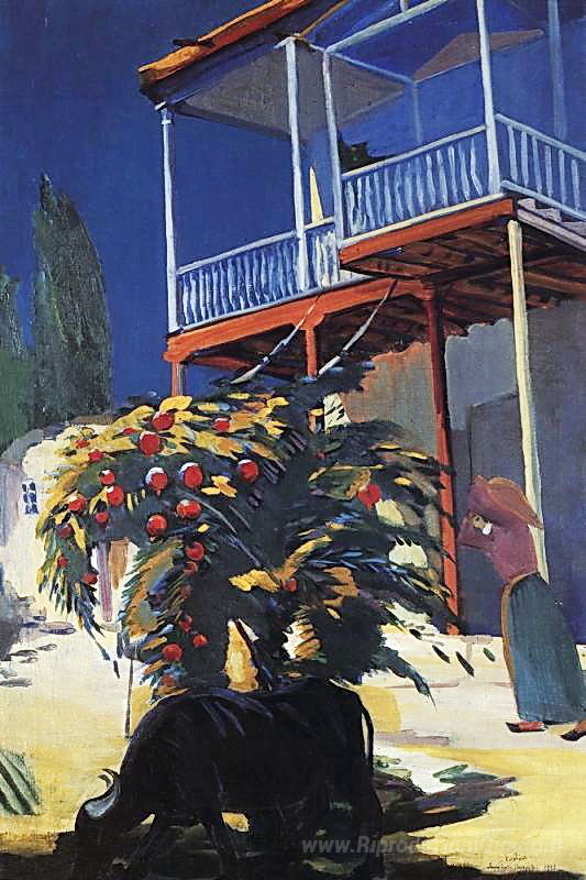 Ti offriamo una riproduzione artigianale su tela dell'opera famosa 'Cortile della casa dell'artista' di Martiros Saryan, dal Museo delle Riproduzioni.