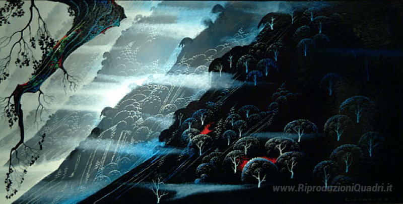 Ti offriamo una riproduzione artigianale su tela dell'opera famosa 'Costa Fogl' di Eyvind Earle, dal Museo delle Riproduzioni.