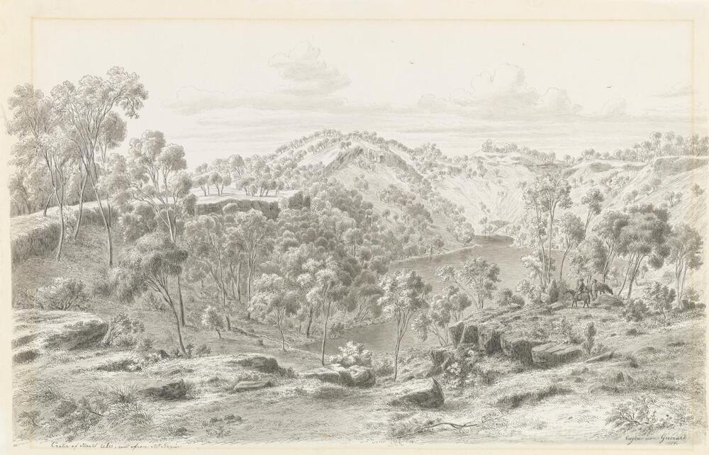 Ti offriamo una riproduzione artigianale su tela dell'opera famosa 'Cratere di Mount Eccles, Ovest da Mount Napier' di Eugene von Guerard, dal Museo delle Riproduzioni.