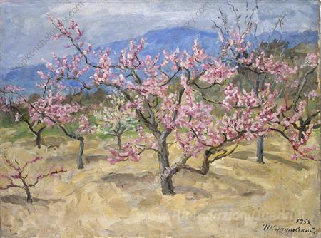 Scoprite l'incanto del dipinto a olio Crimea. Blooming pesco dell'illustre artista russo Pyotr Konchalovsky, un’opera che cattura l’essenza della natura attraverso una palette di colori delicati e armoniosi. Konchalovsky, noto per il suo approccio innovativo e la sua capacità di evocare emozioni, ha saputo unire la tecnica classica alla freschezza di una visione contemporanea, rendendo ogni suo lavoro un pezzo unico e prezioso.