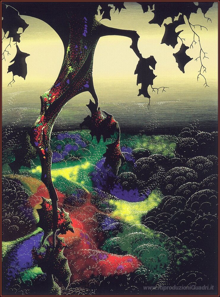 Ti offriamo una riproduzione artigianale su tela dell'opera famosa 'Crimson rosso e oro' di Eyvind Earle, dal Museo delle Riproduzioni.
