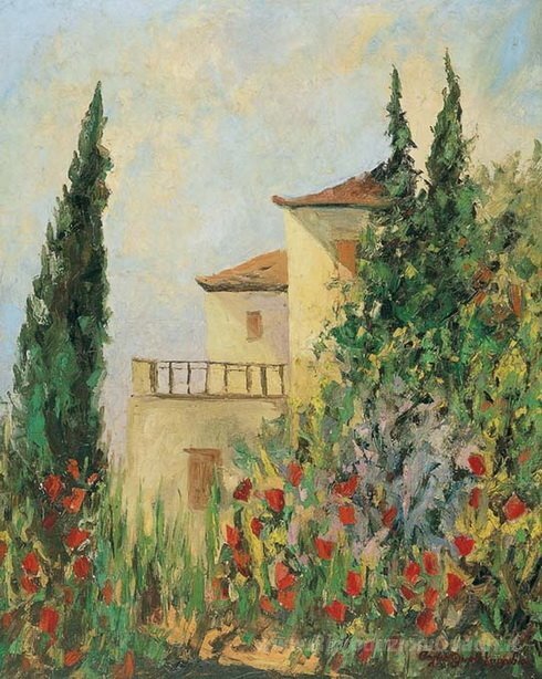 Ti offriamo una riproduzione artigianale su tela dell'opera famosa 'Cypress-Casa' di Thalia Flora-Karavia , dal Museo delle Riproduzioni.