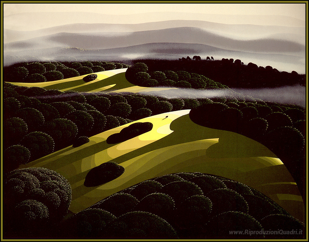 Ti offriamo una riproduzione artigianale su tela dell'opera famosa 'Delle Colline e Valli' di Eyvind Earle, dal Museo delle Riproduzioni.