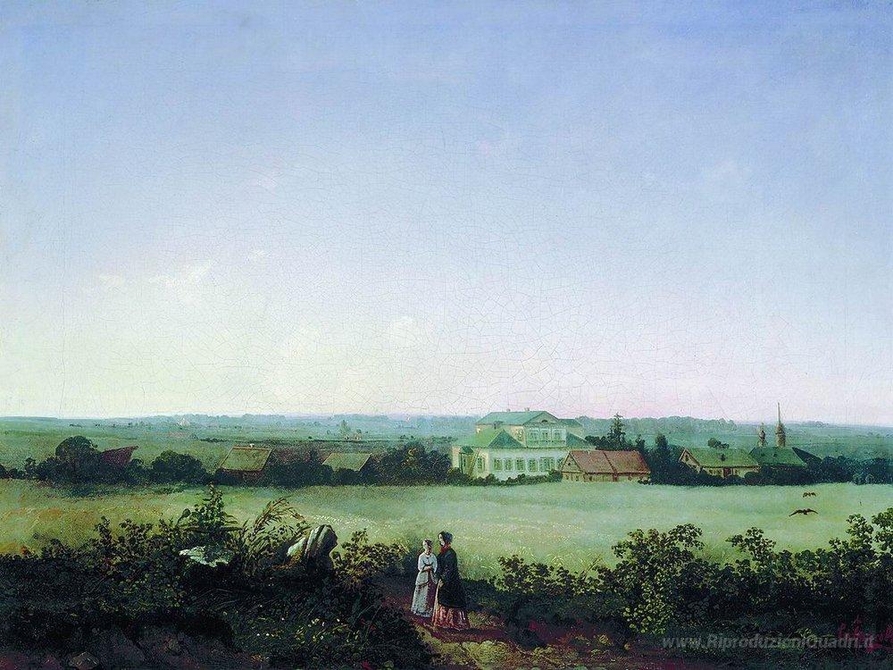 Ti offriamo una riproduzione artigianale su tela dell'opera famosa 'Digitare alla periferia di Mosca al maniero e due figure femmini' di Aleksey Savrasov, dal Museo delle Riproduzioni.