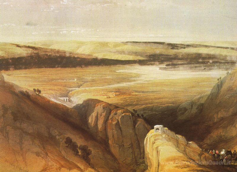Ti offriamo una riproduzione artigianale su tela dell'opera famosa 'Discesa nella Valle del Giordano' di David Roberts, dal Museo delle Riproduzioni.