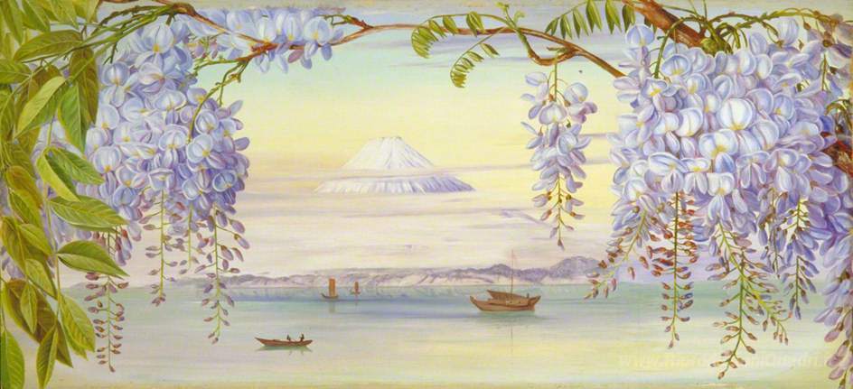 Ti offriamo una riproduzione artigianale su tela dell'opera famosa 'Distant View del monte Fujiyama, in Giappone, e Glicine' di Marianne North, dal Museo delle Riproduzioni.