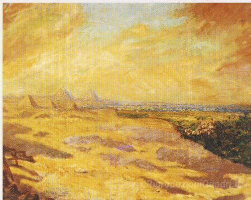 Ti offriamo una riproduzione artigianale su tela dell'opera famosa 'Distant View delle Piramidi' di Winston Churchill, dal Museo delle Riproduzioni.