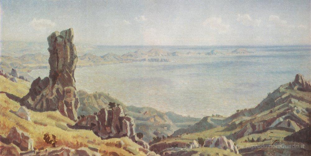 Ti offriamo una riproduzione artigianale su tela dell'opera famosa 'Dito del diavolo' di Konstantin Bogaevsky, dal Museo delle Riproduzioni.