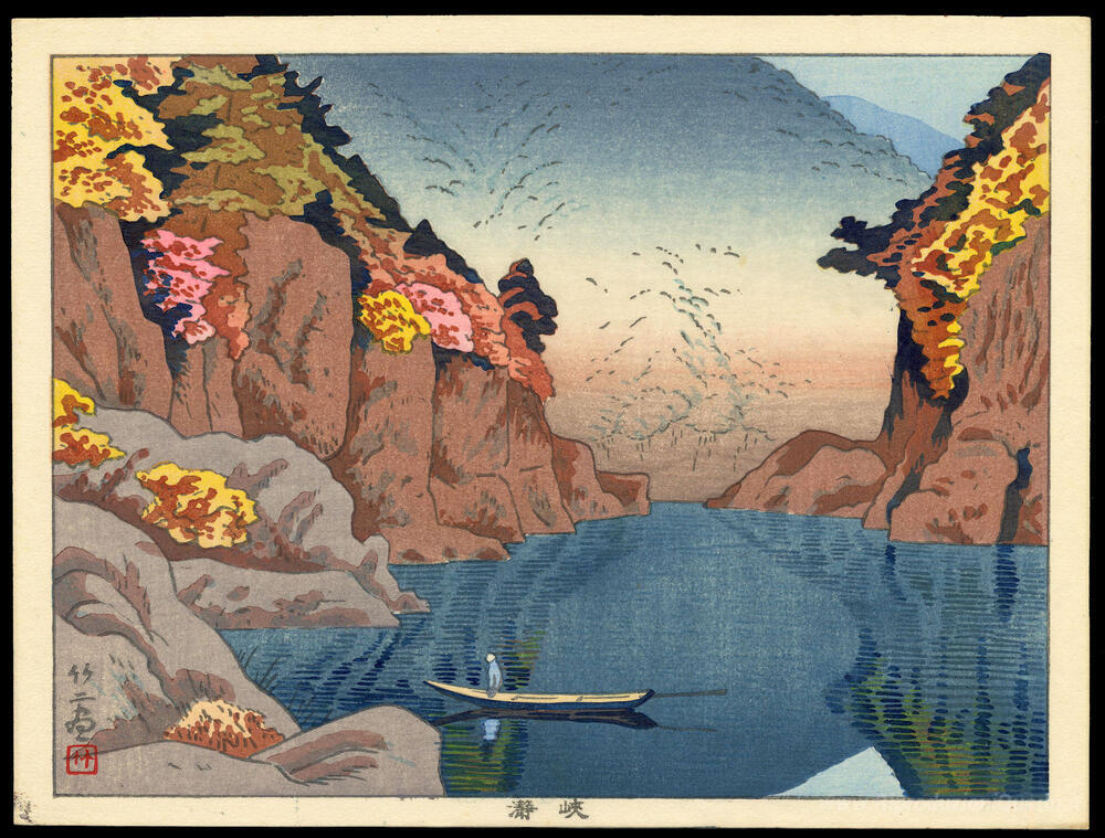 Ti offriamo una riproduzione artigianale su tela dell'opera famosa 'Dorokyo Gorge' di Asano Takeji, dal Museo delle Riproduzioni.