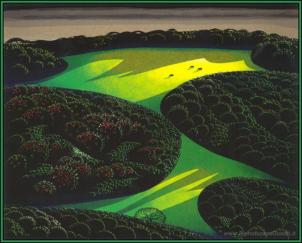 Ti offriamo una riproduzione artigianale su tela dell'opera famosa 'Due Emerald Gioielli' di Eyvind Earle, dal Museo delle Riproduzioni.