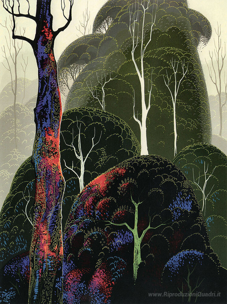 Ti offriamo una riproduzione artigianale su tela dell'opera famosa 'Early Autumn' di Eyvind Earle, dal Museo delle Riproduzioni.