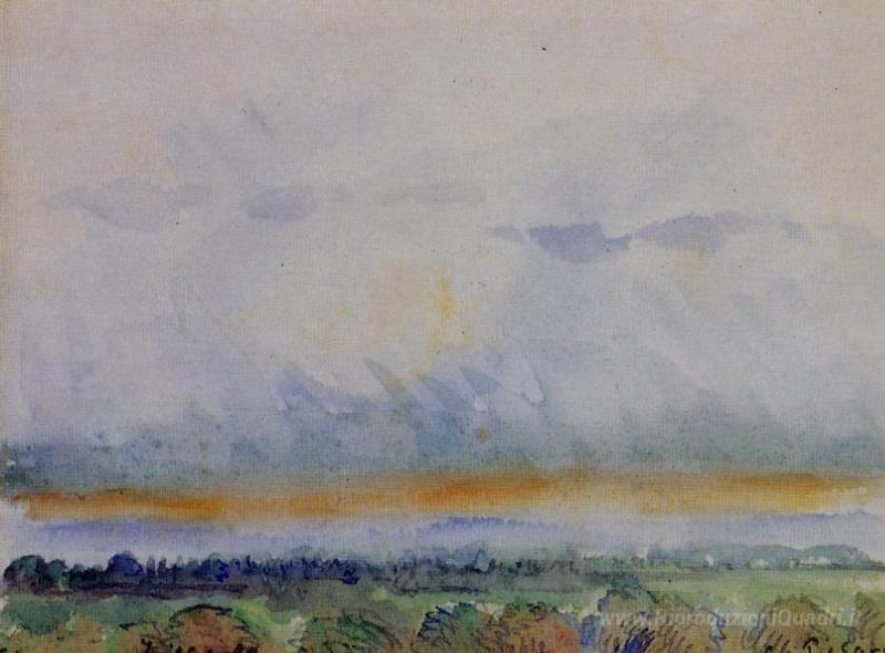 Ti offriamo una riproduzione artigianale su tela dell'opera famosa 'Eragny, Tramonto' di Camille Pissarro, dal Museo delle Riproduzioni.