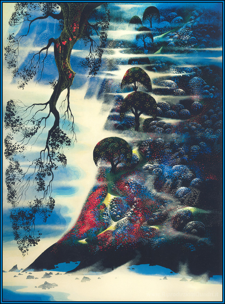 Ti offriamo una riproduzione artigianale su tela dell'opera famosa 'Estate Morning Mist' di Eyvind Earle, dal Museo delle Riproduzioni.