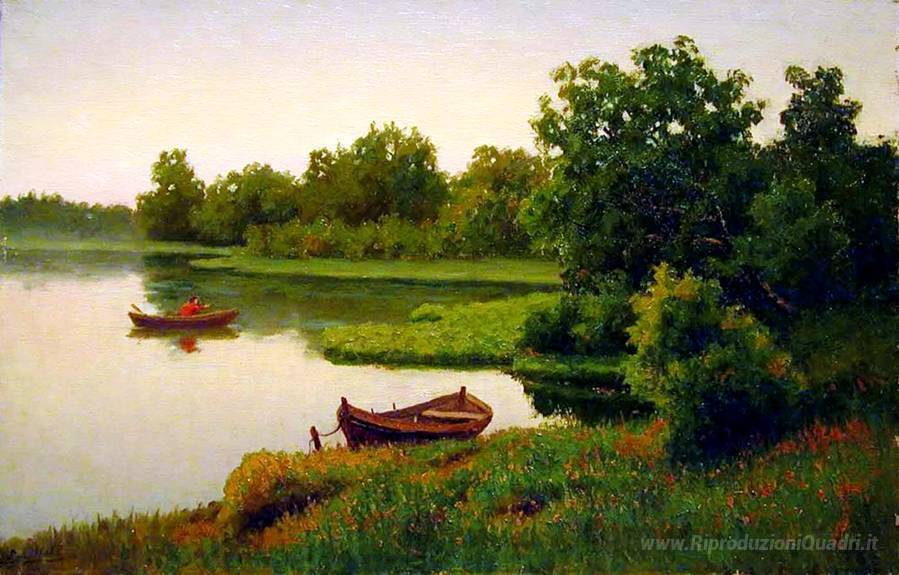 Ti offriamo una riproduzione artigianale su tela dell'opera famosa 'Estate Paesaggio con pescatore' di Efim Volkov, dal Museo delle Riproduzioni.