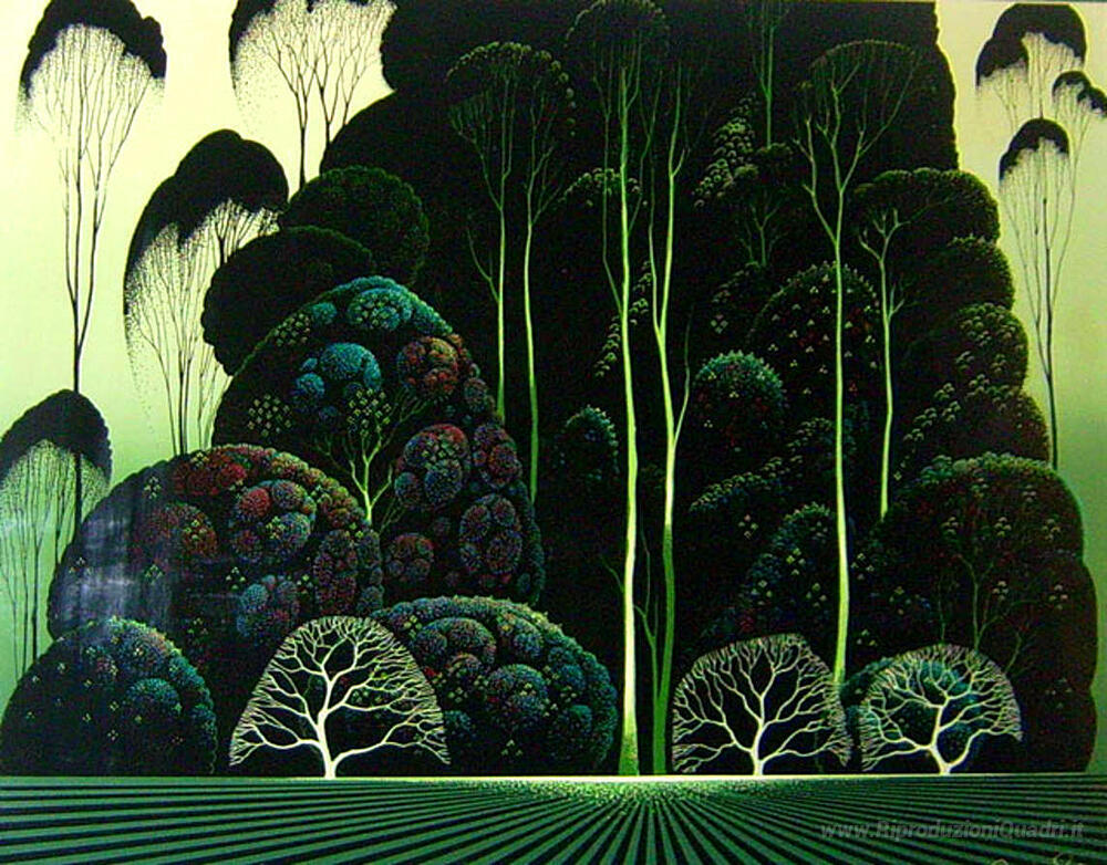 Ti offriamo una riproduzione artigianale su tela dell'opera famosa 'Eucalipto' di Eyvind Earle, dal Museo delle Riproduzioni.