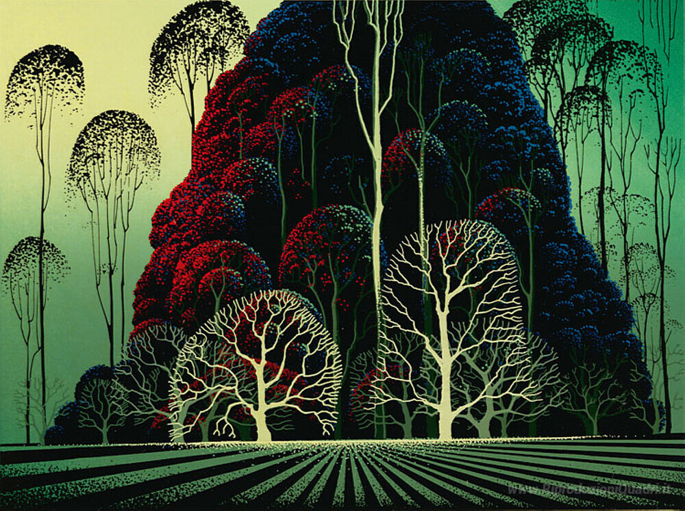 Ti offriamo una riproduzione artigianale su tela dell'opera famosa 'Eucalyptus Foresta' di Eyvind Earle, dal Museo delle Riproduzioni.