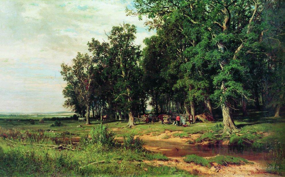 Ti offriamo una riproduzione artigianale su tela dell'opera famosa 'Falciatura nel boschetto di querce' di Ivan Shishkin, dal Museo delle Riproduzioni.