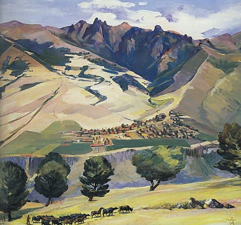 Ti offriamo una riproduzione artigianale su tela dell'opera famosa 'Fattoria collettiva del villaggio Karindzh in montagna Tumanyan' di Martiros Saryan, dal Museo delle Riproduzioni.