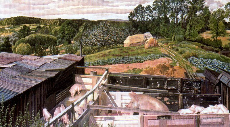 Ti offriamo una riproduzione artigianale su tela dell'opera famosa 'Fattoria di Rickett, Cookham Dene' di Stanley Spencer, dal Museo delle Riproduzioni.