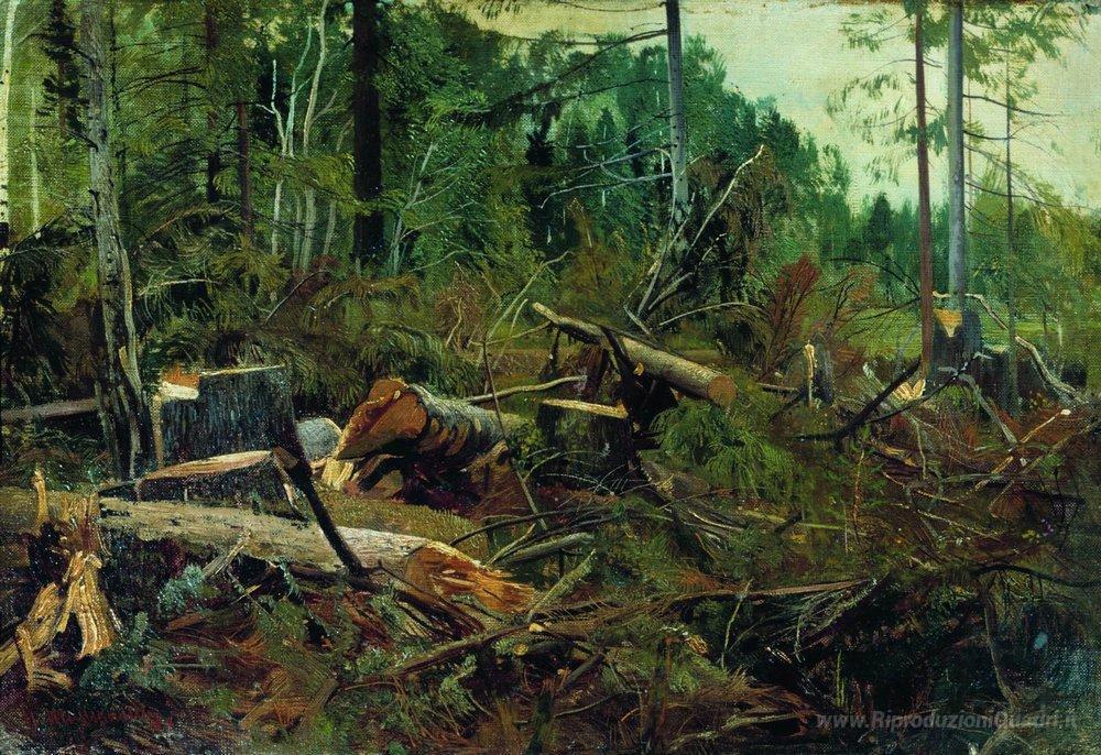 Ti offriamo una riproduzione artigianale su tela dell'opera famosa 'Felling' di Ivan Shishkin, dal Museo delle Riproduzioni.
