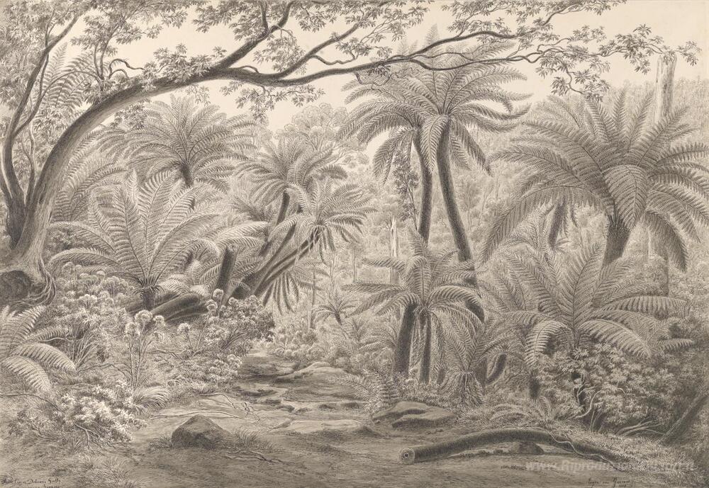 Ti offriamo una riproduzione artigianale su tela dell'opera famosa 'Ferntree Gully o di Dobson, Dandenong Ranges' di Eugene von Guerard, dal Museo delle Riproduzioni.