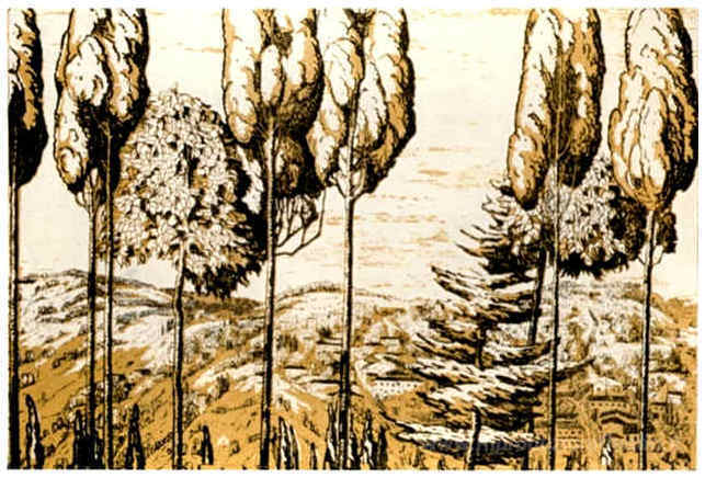 Ti offriamo una riproduzione artigianale su tela dell'opera famosa 'Fiesole, Italia' di Anna Ostroumova-Lebedeva, dal Museo delle Riproduzioni.
