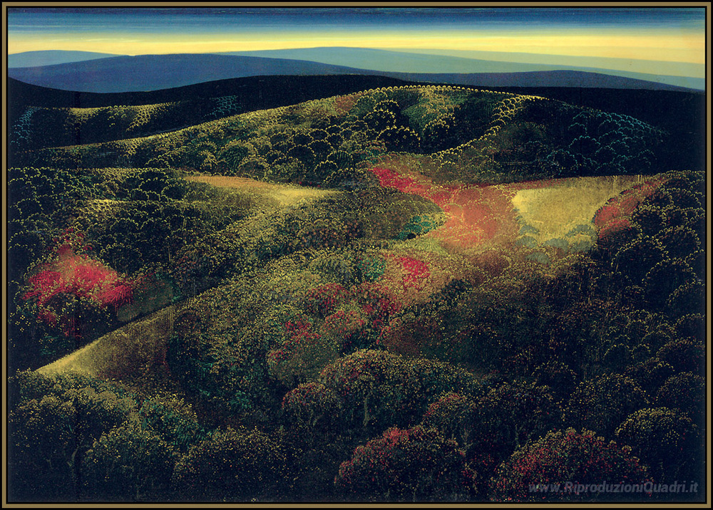 Ti offriamo una riproduzione artigianale su tela dell'opera famosa 'Fine ottobre' di Eyvind Earle, dal Museo delle Riproduzioni.