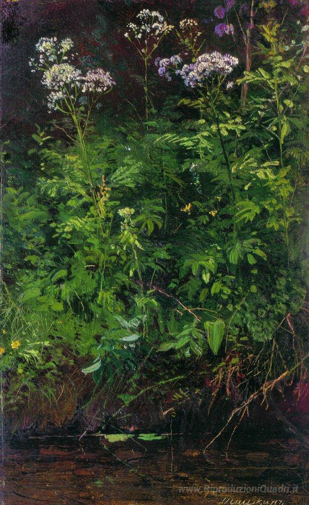 Ti offriamo una riproduzione artigianale su tela dell'opera famosa 'Fiori di campo vicino all'acqua' di Ivan Shishkin, dal Museo delle Riproduzioni.