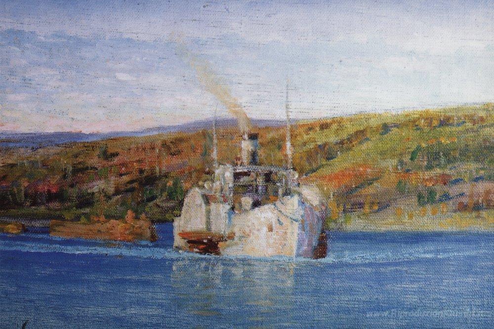 Ti offriamo una riproduzione artigianale su tela dell'opera famosa 'Fiume Oka. Vladimir vapore trasformato in un rimorchio.' di Vasily Polenov, dal Museo delle Riproduzioni.