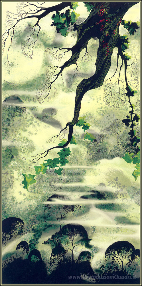 Ti offriamo una riproduzione artigianale su tela dell'opera famosa 'Fog Bound' di Eyvind Earle, dal Museo delle Riproduzioni.