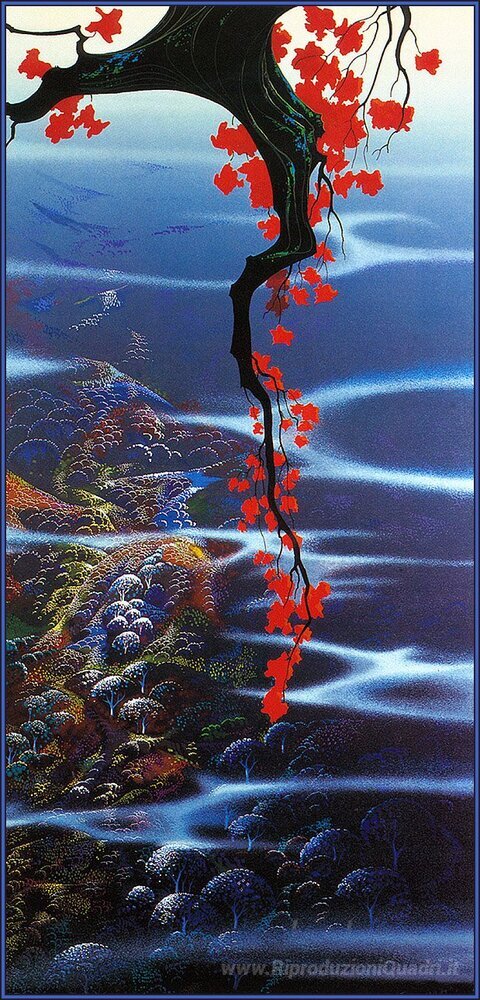 Ti offriamo una riproduzione artigianale su tela dell'opera famosa 'Foglie rosse' di Eyvind Earle, dal Museo delle Riproduzioni.