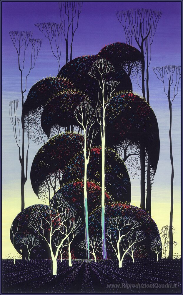 Ti offriamo una riproduzione artigianale su tela dell'opera famosa 'Foresta Arabesque' di Eyvind Earle, dal Museo delle Riproduzioni.