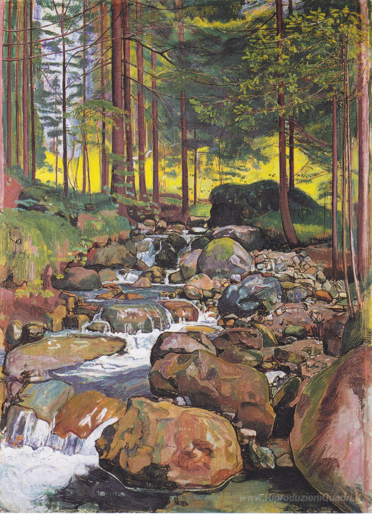 Ti offriamo una riproduzione artigianale su tela dell'opera famosa 'Foresta con un ruscello di montagna' di Ferdinand Hodler, dal Museo delle Riproduzioni.
