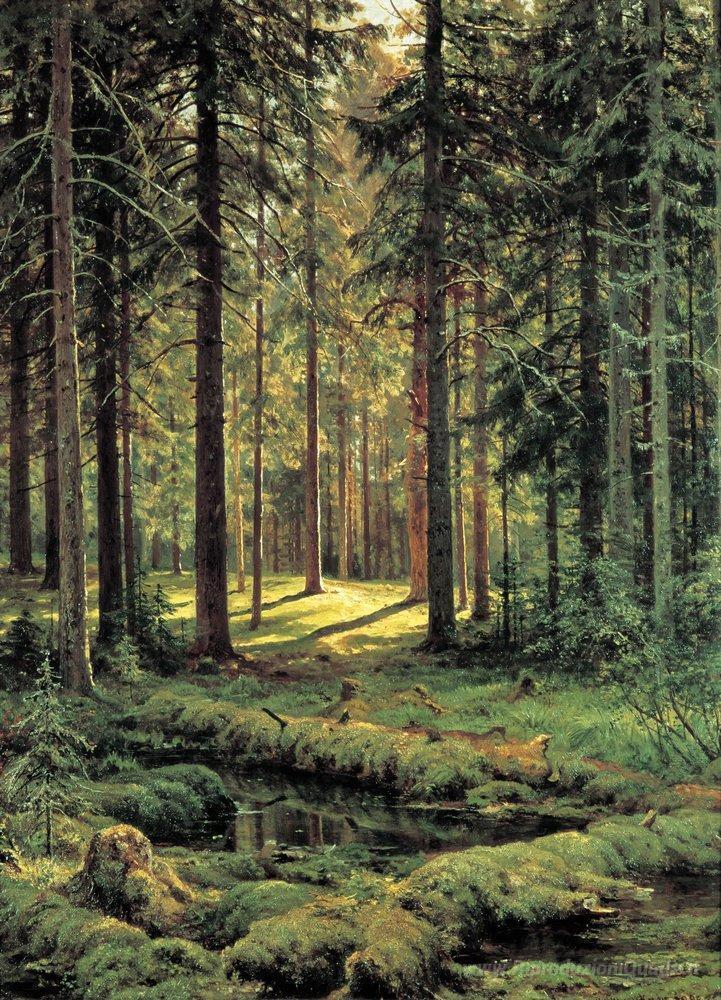 Scopri l'incanto di Foresta di conifere. Giorno soleggiato, un'opera sublime del maestro russo Ivan Shishkin, uno dei più importanti artisti del XIX secolo. Famoso per la sua abilità nel catturare la bellezza della natura, Shishkin trasmette, attraverso questa affascinante composizione, la luce e l'atmosfera di una foresta rigogliosa sotto il calore di un giorno soleggiato.